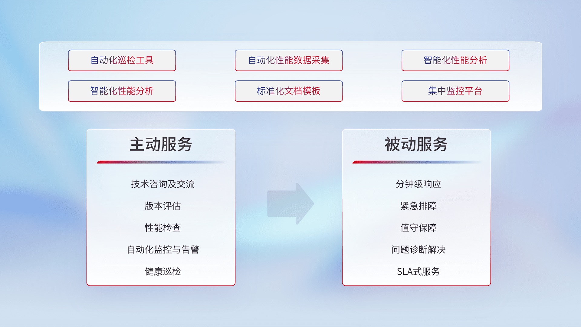 智能化工具和标准化文档,,保障服务质量,,提供主动服务(包含技术咨询、、、、版本评估、、性能检查、、、自动化监控与告警、、、、健康巡检)和被动服务包含(分钟级响应、、紧急排障、、、值守保障、、、问题诊断解决、、、、SLA服务)。。